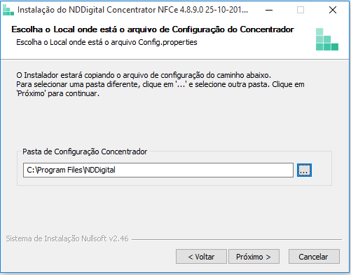 Escolha o Local onde está o Arquivo de Configuração do Concentrador: Na tela abaixo, se desejar poderá alterar o diretório do arquivo de configuração do Concentrador, após a escolha clique em Próximo.