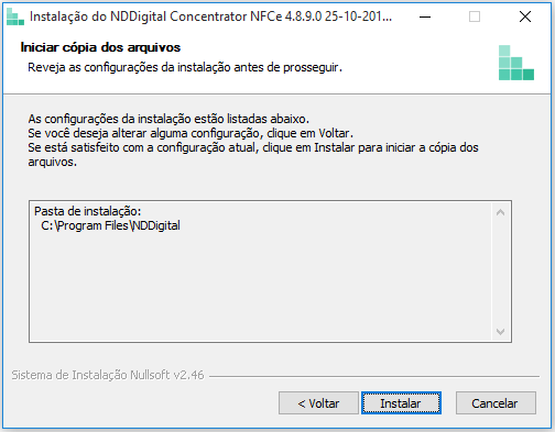 Iniciar Cópia dos Arquivos: As configurações realizadas são listadas antes de iniciar a instalação. Reveja as configurações, caso deseje alterar alguma delas, clique em voltar. Se todos os parâmetros configurados estiverem de acordo com o desejado, clique no botão Instalar para iniciar a instalação do produto.