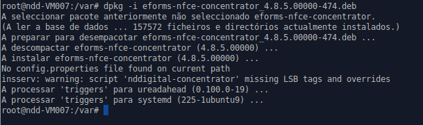 Exemplo do comando: dpkg -i eforms-nfce-concentrator_4.8.5.00000.deb