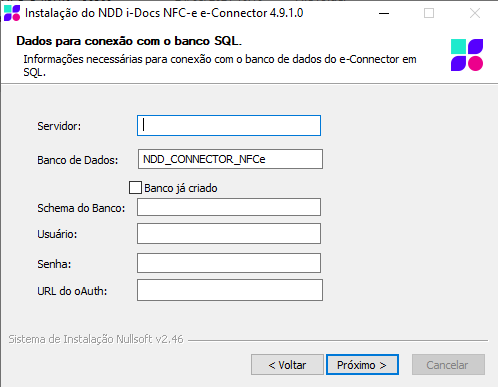 ▪Banco já Criado: Esta opção será marcada quando a criação da base de dados de processamento do e-Connector NFC-e for realizada através de script DDL, executado pela equipe responsável por manter o servidor de banco de dados no cliente;
