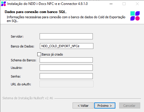 Também são informados os dados de conexão com o banco de dados do Cold de Exportação, as informações dos dados seguem o mesmo conceito da conexão com o banco de dados do Connector NFC-e, conforme a descrição de cada campo no passo 3, considerando que as informações inseridas são direcionadas para o banco de dados do Cold de Exportação. Se no momento da instalação, for selecionada uma das opções de SQL, a tela abaixo será exibida. Após informar os dados, clique no botão Próximo para dar sequência.