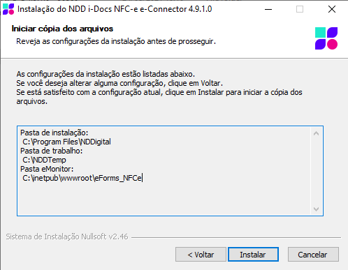 As configurações realizadas são listadas antes de iniciar a instalação. Reveja as configurações, caso deseje alterar alguma delas, clique em voltar. Se todos os parâmetros configurados estiverem de acordo com o desejado, clique no botão Instalar para iniciar a instalação do produto.