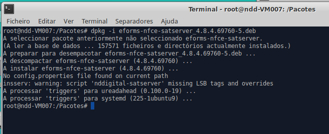Exemplo do comando: dpkg -i eforms-nfce-satserver_4.8.5.00000.deb