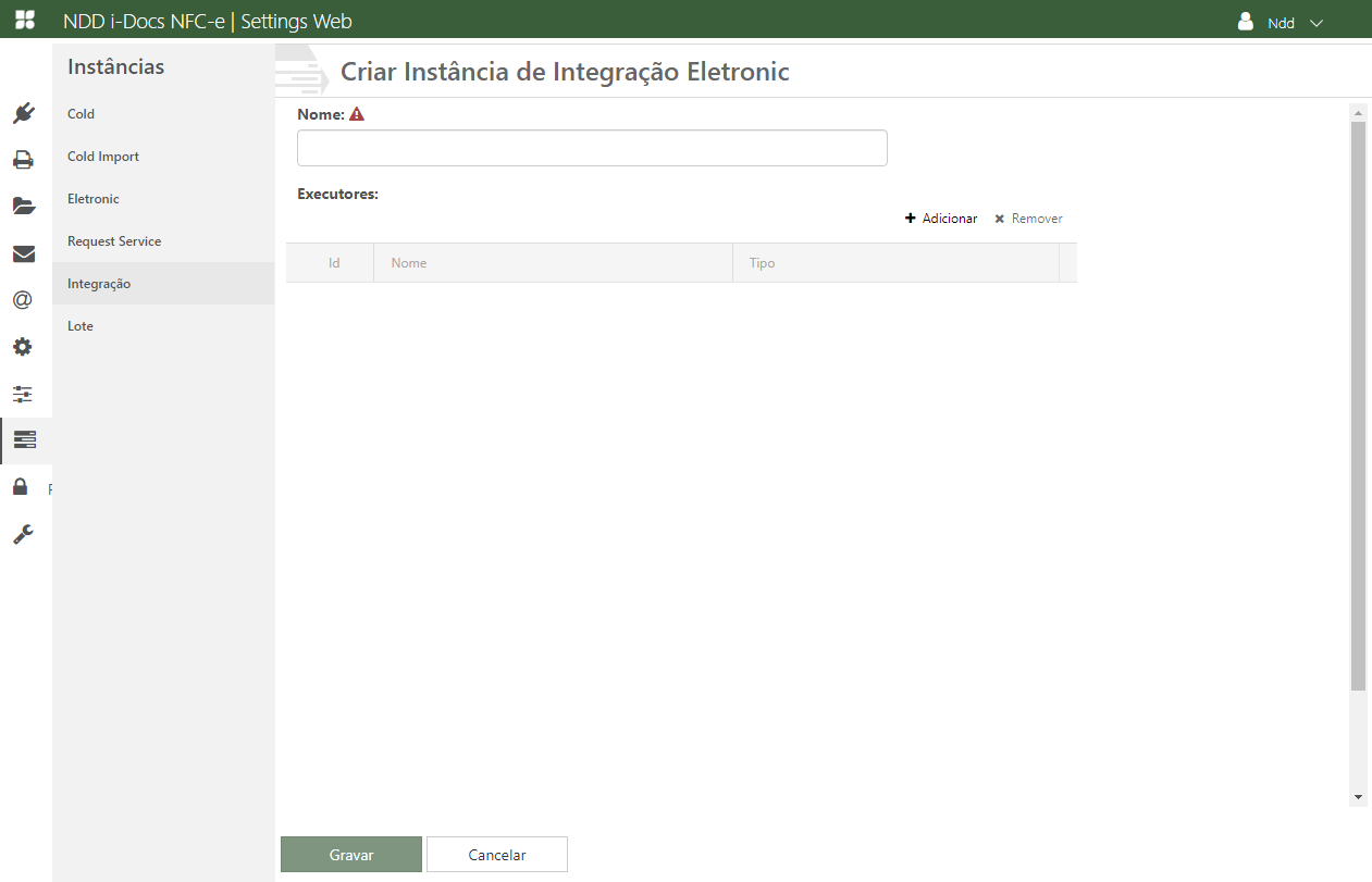 Para cadastrar uma nova instância de integração eletronic clique em +Novo. Será exibida a tela para o cadastro, preencha conforme descrito abaixo.