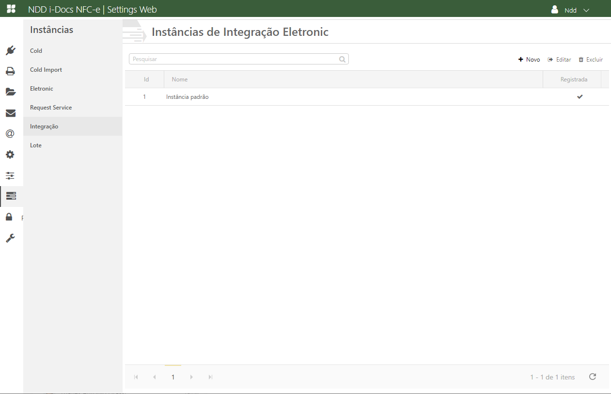 Acesse o e-Connector Settings e na área de Instâncias, clique em Integração. A seguinte tela é apresentada: