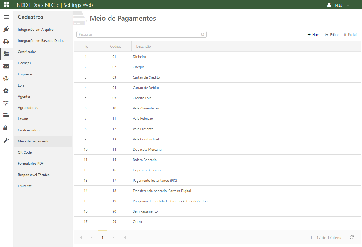 ✓Não cadastrar Meios de Pagamento com Caracteres Especiais; ✓Os Meios de Pagamentos cadastrados nessa aba serão utilizados apenas na impressão através do e-Agent; ✓Os Meio de Pagamentos padrão do sistema estão disponíveis na Tabela de Códigos dos meios de pagamentos publicada no Portal Nacional da Nota Fiscal Eletrônica. |