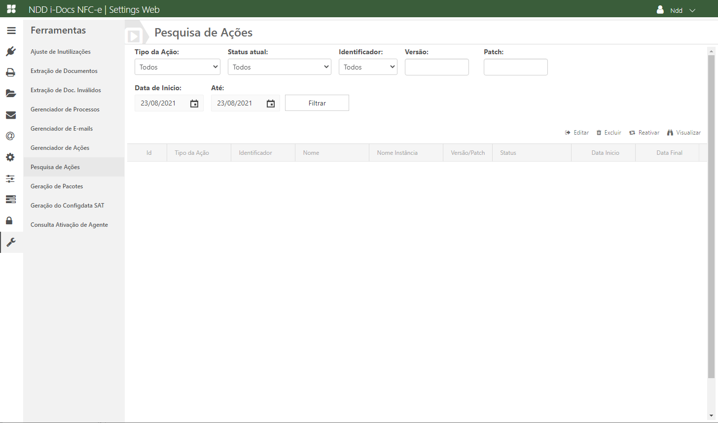 Acesse o e-Connector Settings e na área de Ferramentas, clique em Pesquisa de Ações. A seguinte tela é apresentada: