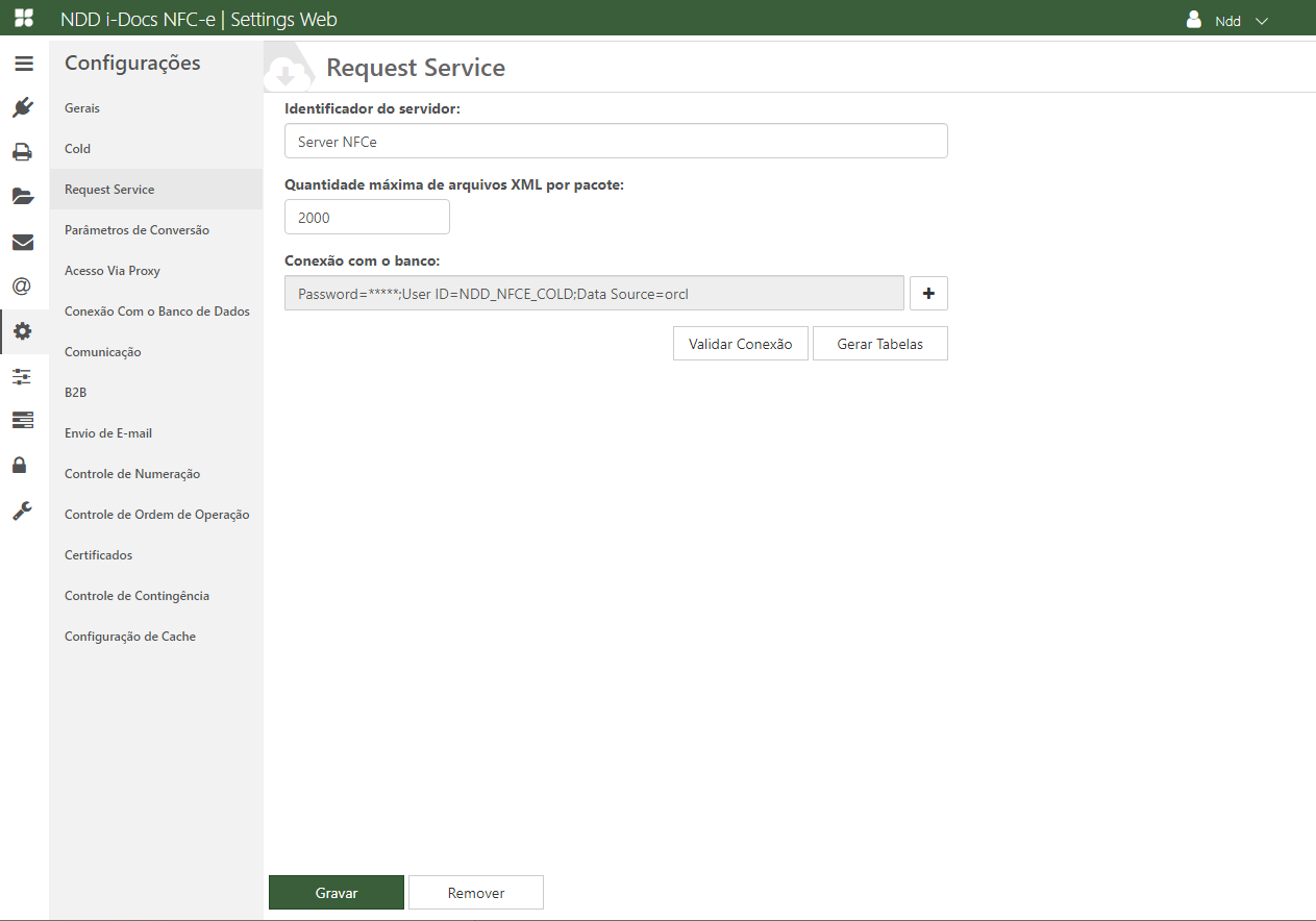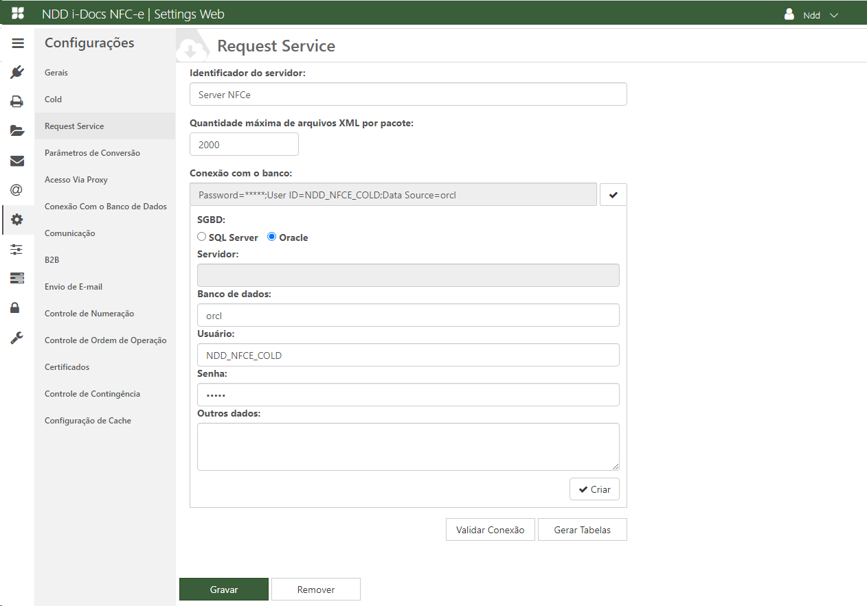 Após preencher todos os campos necessários, clique em Validar Conexão, se os dados estiverem corretos as tabelas (tbRequest, tbRequestDocument e tbRequestInstance) poderão ser geradas através do botão Gerar tabelas.