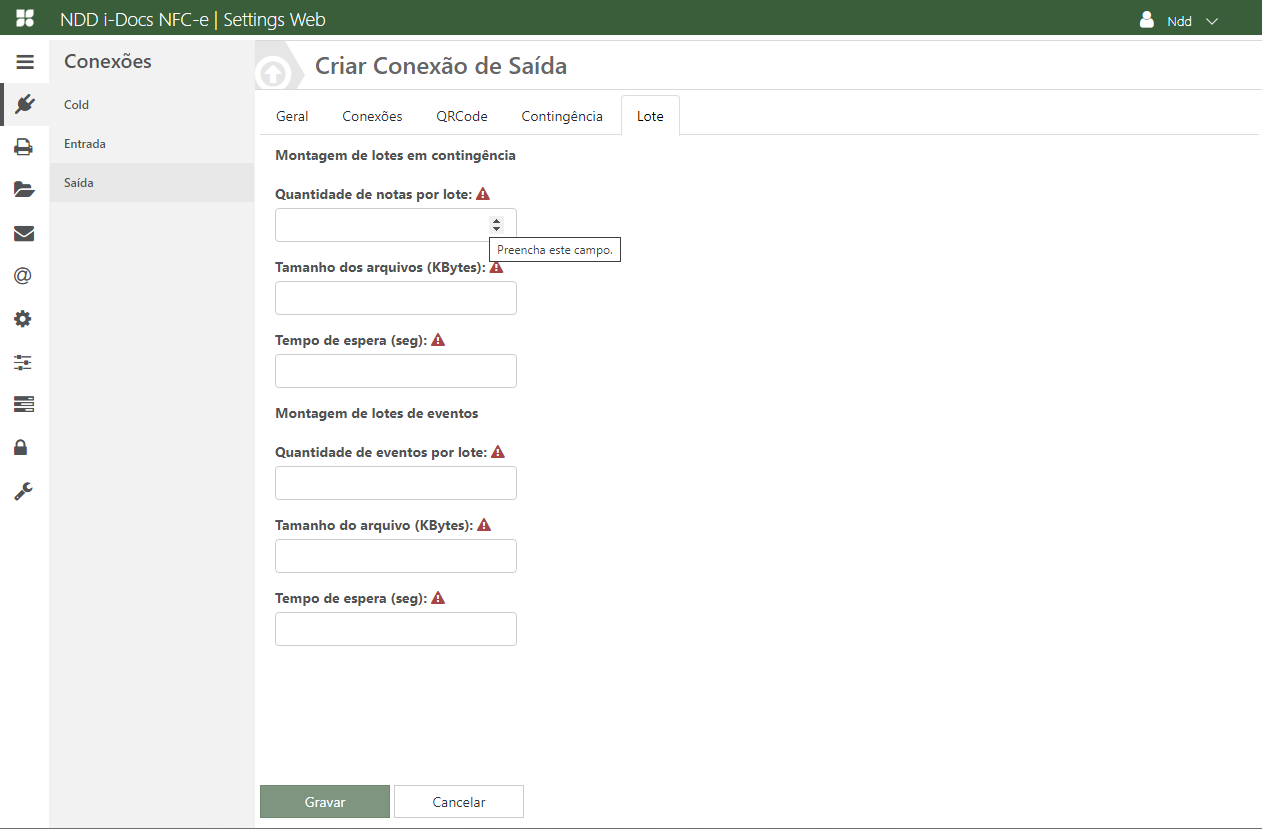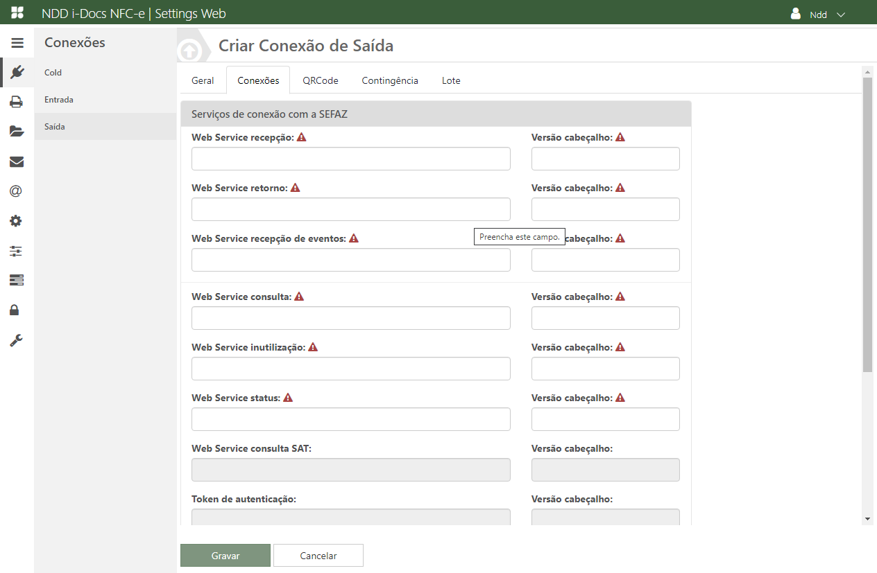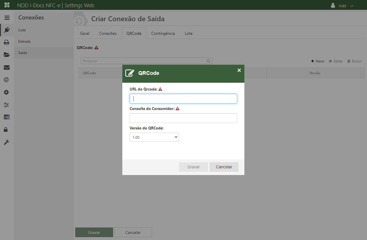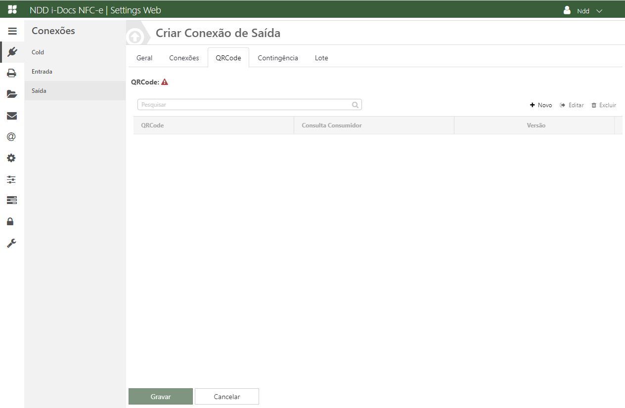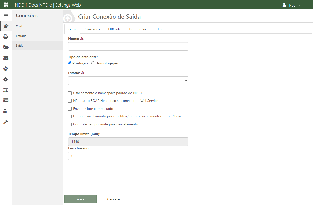 Acesse o e-Connector Settings e na área de conexões, clique em Saída. A seguinte tela é apresentada: