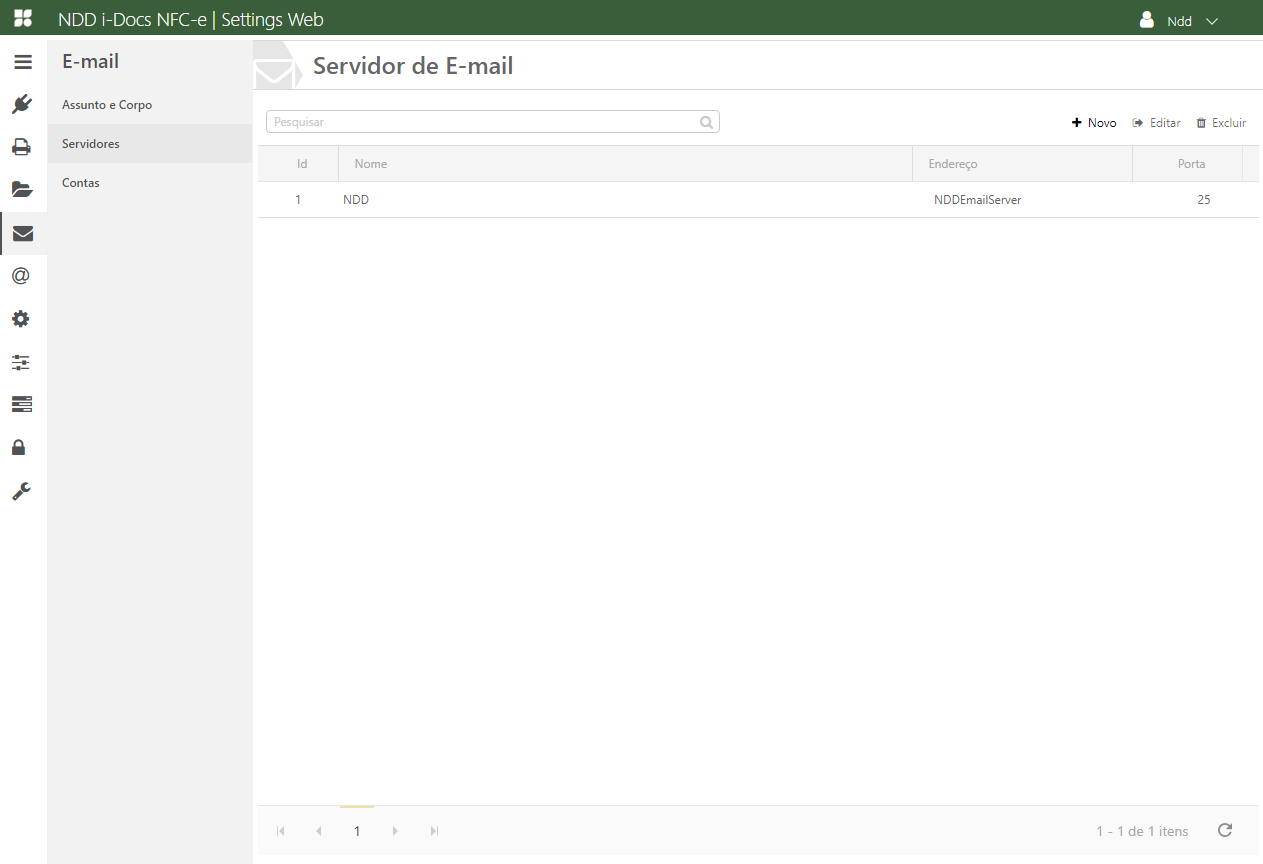Para cadastrar um novo servidor de e-mail clique em +Novo. Será exibida a tela para cadastro dos dados, preencha-os conforme descrito abaixo