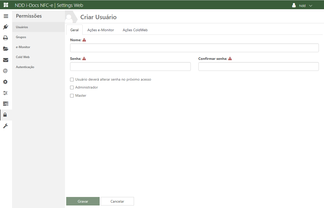 Marque as ações que este usuário irá possuir ao acessar o e-ColdWeb.