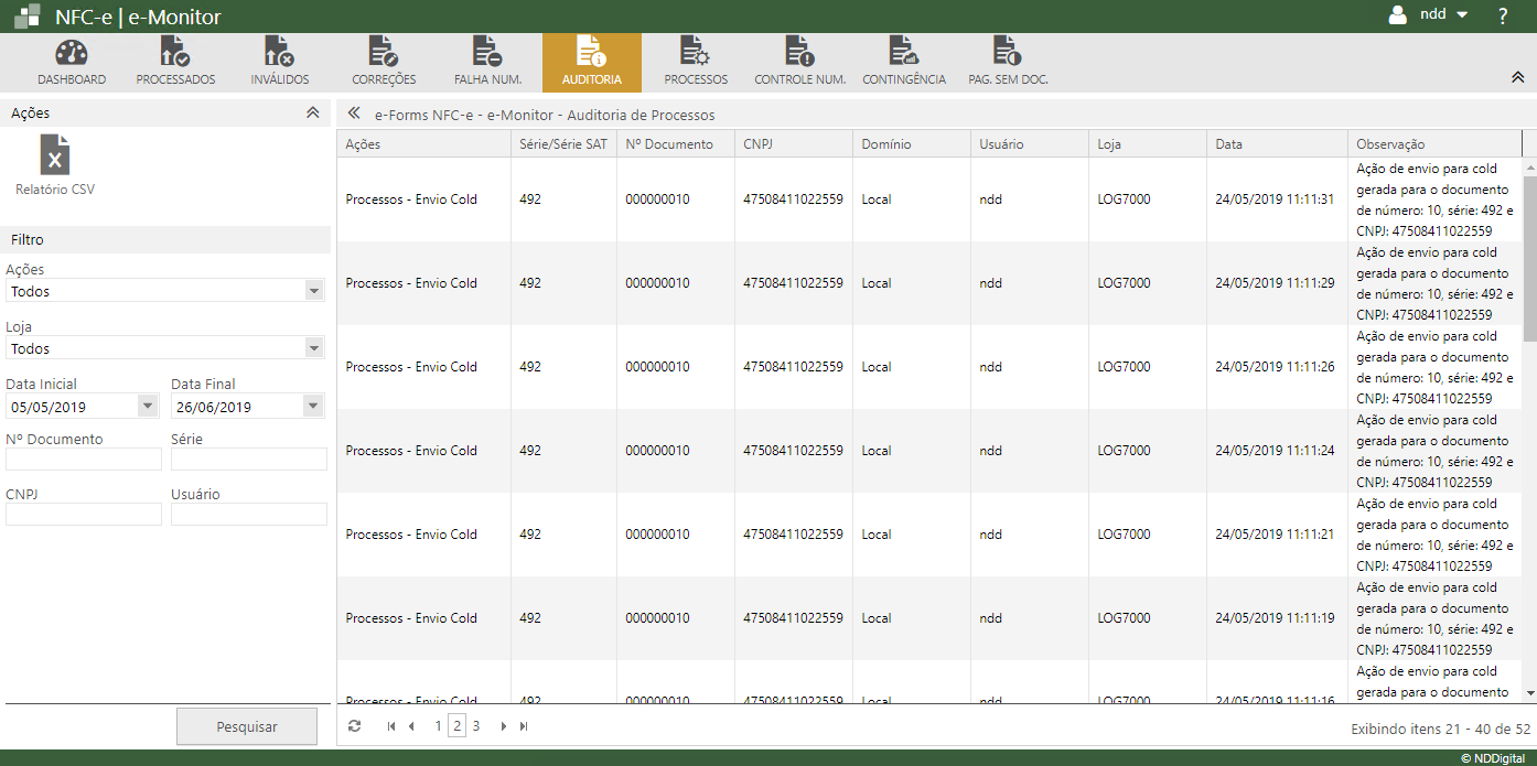 Através da área Ações, contida a esquerda da tela, é possível baixar um relatório de todos os registros apresentados na tela de acordo com a pesquisa realizada. O arquivo .csv extraído contém dados como: data, série/Série SAT, nº documento, CNPJ, ações, domínio, usuário e loja.