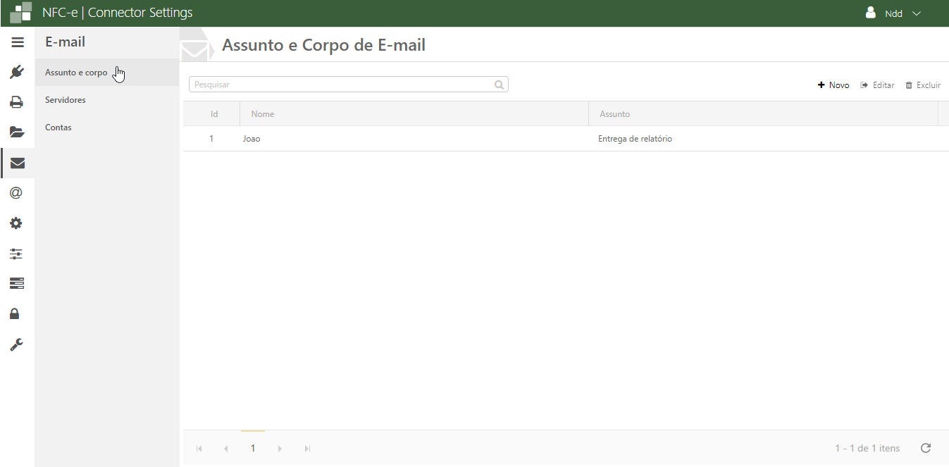 Para cadastrar um novo assunto e corpo de e-mail clique em +Novo. Será exibida a tela para cadastro dos dados, preencha-os conforme descrito abaixo.
