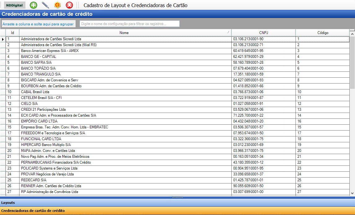 Acesse o e-Connector Settings e na área de configurações, clique em Layouts e Credenciadoras > Credenciadoras de cartão de crédito. A seguinte tela é apresentada: