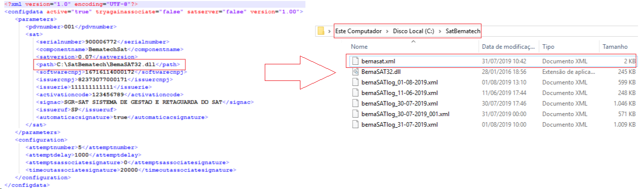 ✓ O arquivo bemasat.xml também deve ser inserido na pasta onde a dll encontra-se, a qual é apontada no configdata, conforme imagem.