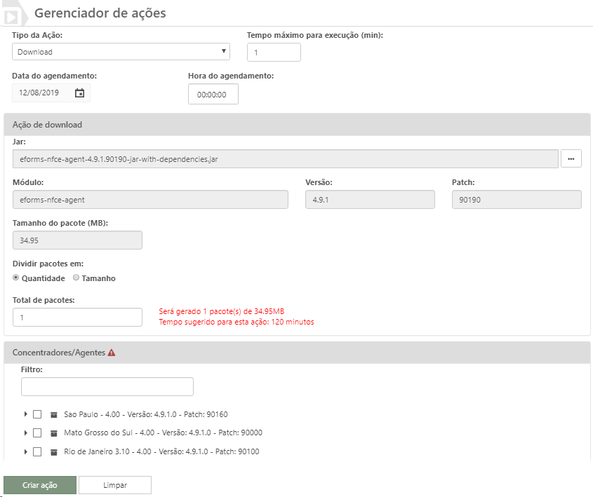 ✓ Total de pacotes: Total de pacotes, o qual será gerado 1 pacote(s) de 34.95MB, onde o tempo sugerido para esta ação é de 120 minutos.