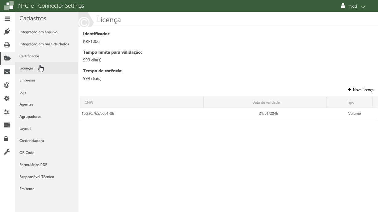 Acesse o e-Connector Settings e na área de configurações, clique em Licenças. A seguinte tela é apresentada: