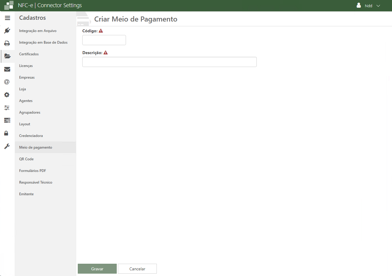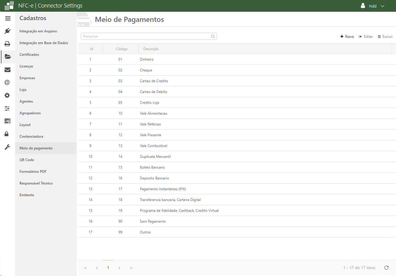 Acesse o e-Connector Settings e na área de cadastros, clique em Meio de Pagamento. A seguinte tela é apresentada: