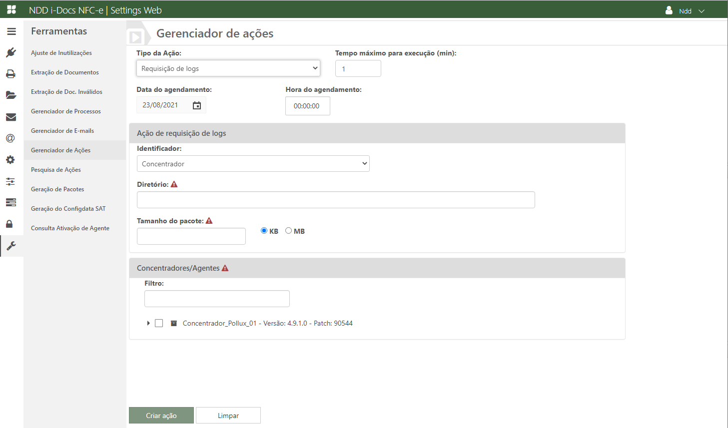 - Após ser criado uma ação, a mesma pode ser pesquisada na aba pesquisar ações; - A ação de requisição de logs permite valores em KB e MB; - Quando for selecionado KB deverá ser com valor mínimo de 10 KB e no máximo de 1024 KB; - Quando for selecionado MB deverá validar como valor mínimo de 1 MB e no máximo de 1024 MB.s. |