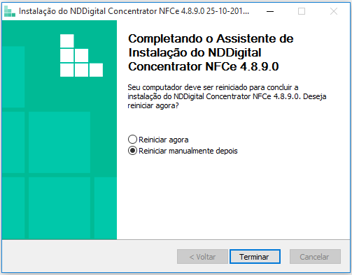 Instalação concluída: A tela abaixo mostra que a instalação foi concluída, selecione a opção de reinicialização desejada e após clique em Terminar para finalizar a instalação.