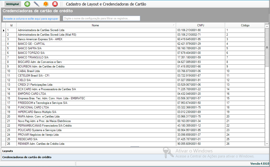 o usuário poderá adicionar uma nova Credenciadora de Cartão;