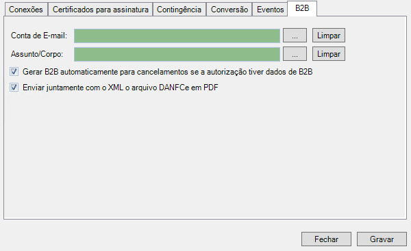 ▪Gerar B2B automaticamente para cancelamentos: Ao marcar esta opção, será enviado um e-mail para todo documento cancelado que tiver as linhas B2B em sua autorização, não sendo necessário os dados B2B no envio do cancelamento.