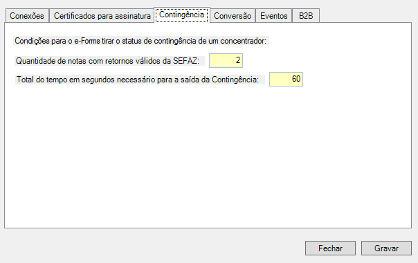 Informe o tempo e quantidade de notas que o e-Forms NFC-e vai mandar para o web Service Síncrono, para obter um retorno válido para tirar o Concentrador do modo de Contingência.
