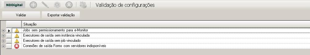 O grid apresenta a descrição de cada situação que é validada e separada em duas categorias: Alerta que exibe o ícone
