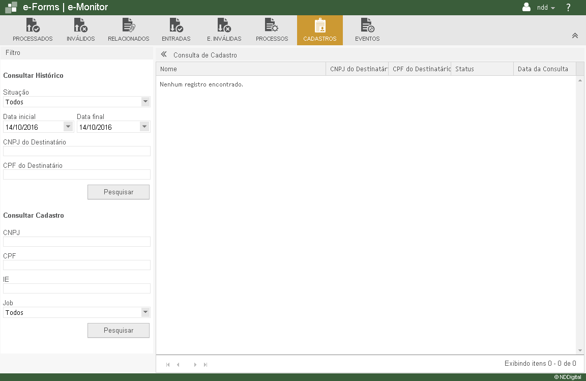 Através desta aba será realizado a consulta do cadastro do contribuinte na SEFAZ ou consultar o histórico das pesquisas antigas.