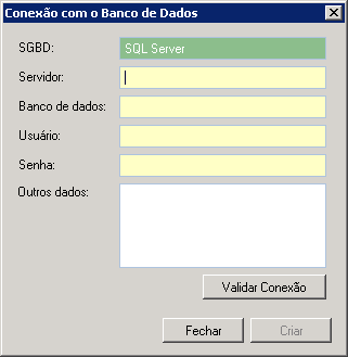 e.Selecione o Sistema Gerenciador de Banco de Dados que será utilizado. Em seguida, clique no botão Criar para especificar os dados de conexão com o banco que será utilizado. A tela abaixo será exibida: