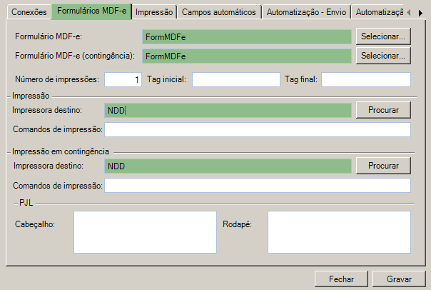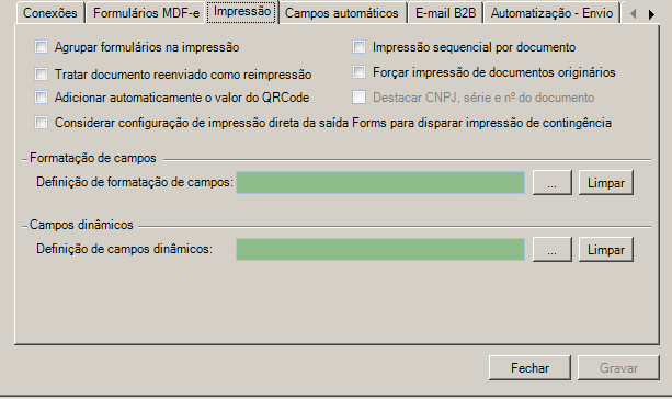 •Considerar configuração de impressão direta da saída Forms para disparar impressão de contingência: Esta opção somente estará ativa caso a opção "Disparar impressão de documentos com tipo de emissão FSDA/Contigência MDF-e antes de autorizá-los na SEFAZ ou EPEC logo após autorizá-lo na Sefaz nacional" se encontrar marcada nas configurações gerais.