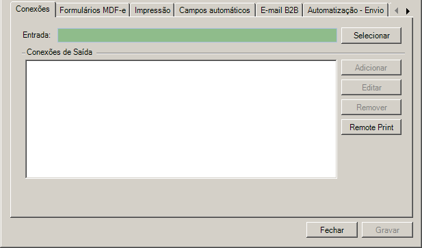 Caso não possua conexões de saída Forms vinculadas ao Job, ao ser acionado o botão "Remote Print" será apresentada uma tela de cadastro de conexões Forms e posteriormente será gerado o pacote. Jobs que já tiveram seus pacotes gerados poderão ter os mesmos atualizados ao acionar o botão pela segunda vez.