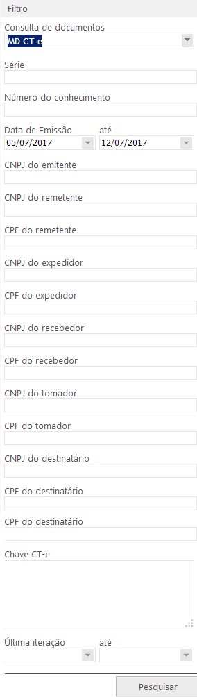 •No campo Última iteração até, será utilizado para filtrar a última modificação do documento. Caso seja informada a última iteração juntamente com a data de emissão, o filtro buscará os documentos dentro do período configurado, prevalecendo a iteração do documento.