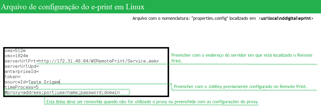 Passo 5: Para ocorrer a comunicação entre os sistemas operacionais, após a instalação e configuração do Remote Print versão 4.2.0, é necessário alterar o arquivo de configuração do módulo e-Forms e-Print presente no diretório de instalação no servidor Linux.