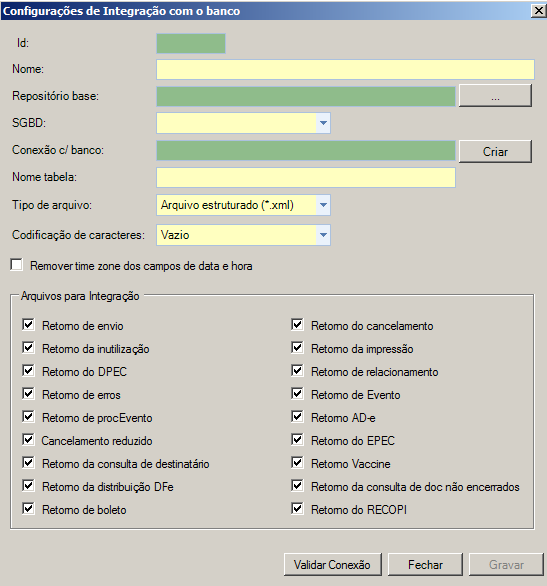 k.Quando marcado a opção Remover time zone dos campos destino do arquivo será removido nas integrações de Retorno de envio ou Retorno de eventos os campos dhRecbto ou dhRegEvento as informações de fuso horário (time zone) quando este for retornado pela SEFAZ para dos documentos de saída.