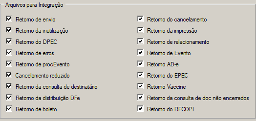 l. Em Arquivos para a Integração pode ser determinado as integrações que serão ou não geradas para o ERP mesmo quando as mesmas forem retornadas. Para não gerar algum retorno, desmarque as opções desejadas e para gerá-las remarque as mesmas.