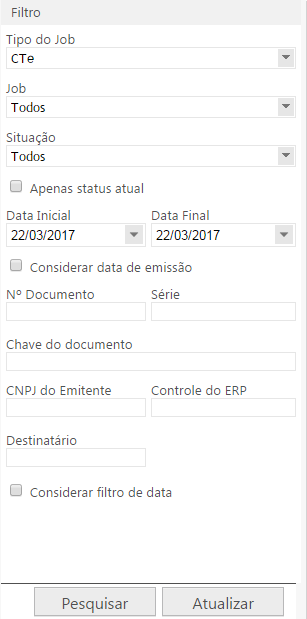 No Filtro Avançado para documentos CT-e é possível efetuar pesquisas por Número, Série, Chave do Documento, CNPJ do Emitente, Controle do ERP ou Destinatário (CPF/CNPJ) ou filtrar por Considerar Filtro de Data.