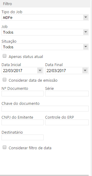 No Filtro Avançado para documentos MDF-e é possível efetuar pesquisas por Número, Série, Chave do Documento, CNPJ do Emitente, Controle do ERP, Destinatário (CPF/CNPJ) ou filtrar por Considerar Filtro de Data.