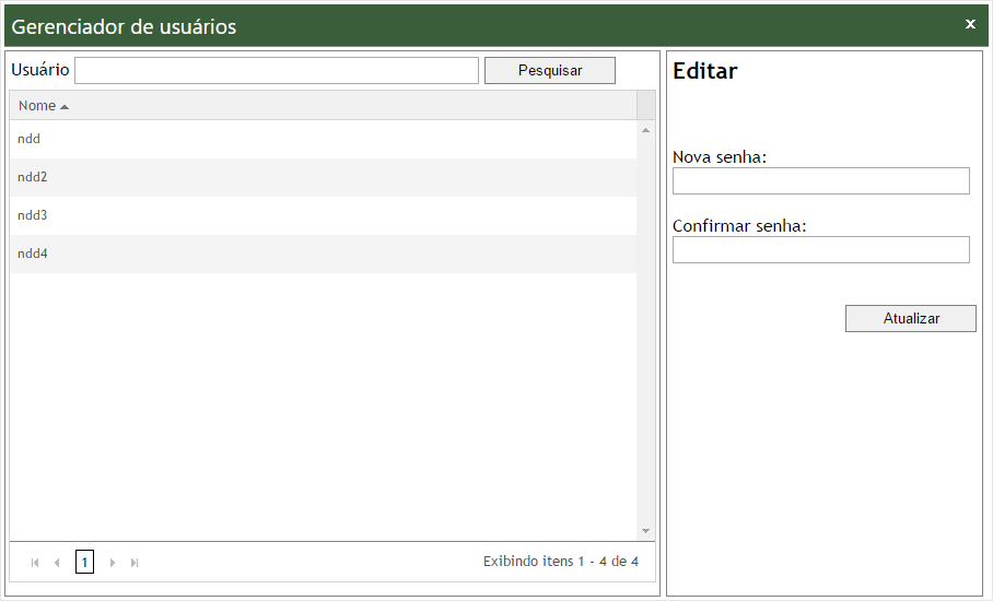 Para atualizar, selecione o usuário no grid e posteriormente digite uma "Nova Senha" no respectivo campo. Digite novamente a senha no campo de Confirmação, e clique em