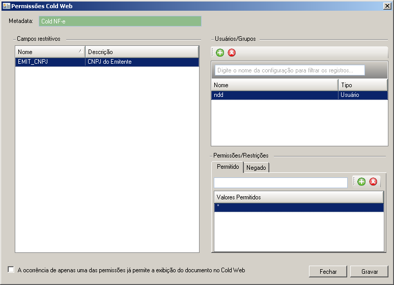 Quando o usuário possuir permissões para quaisquer campos restritivos configurados em conexões cold, ao marcar a opção A ocorrência de apenas uma das permissões já permite a exibição do documento no ColdWeb, será permitido realizar na pesquisa do e-Cold Web as notas que possuem os campos/valores cadastrados satisfazendo pelo menos uma das condições, ou as duas condições, por exemplo, se possuir permissões restritivas de um CNPJ para o campo “EMIT_CNPJ” e também um CNPJ para o campo “DEST_CNPJ” serão exibidos na consulta os documentos que possuírem apenas um dos CNPJs ou os dois CNPJs na mesma nota. Quando desmarcada esta opção será exibido na consulta somente os documentos que possuírem todos os valores permitidos de acordo com os campos cadastrados.