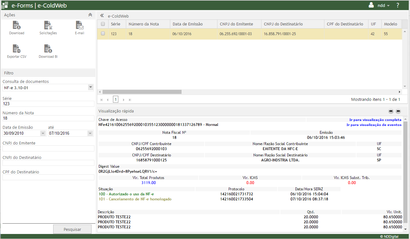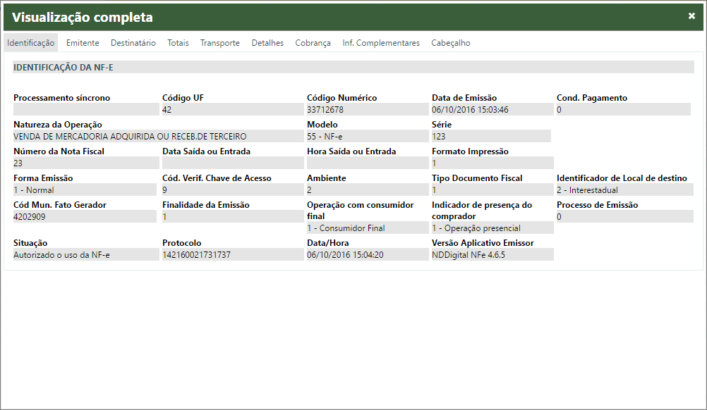 Uma nova tela será aberta com todos os dados da NF-e/CT-e/MDF-e selecionada.