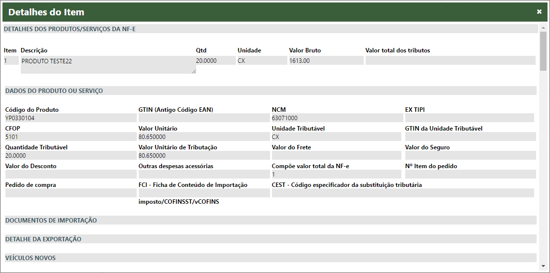 Para documentos NF-e os detalhes dos produtos serão exibidos na aba "Detalhes" e este apresentará Item, Descrição e QTd e Valor Bruto de cada produto.
