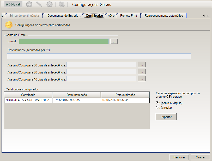 c.No campo E-mail, selecione a conta de e-mail a ser utilizada para enviar alertas, caso haja algum certificado prestes a expirar.