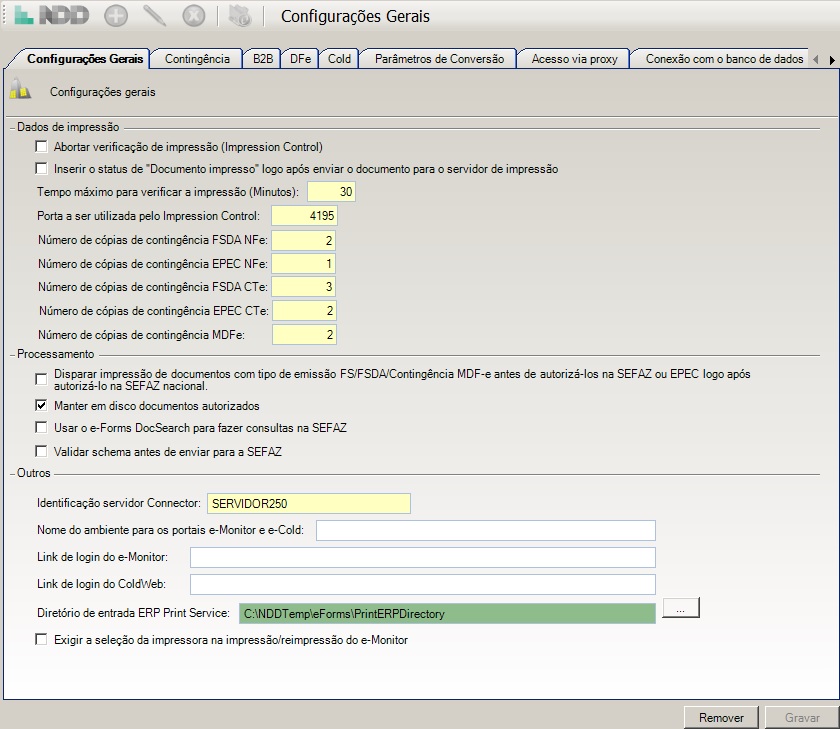 Abortar verificação de impressão (Impression Control): esta opção desabilita a comunicação com o Impression Control, serviço que é instalado com o módulo e-Print e é responsável por confirmar a impressão dos documentos.