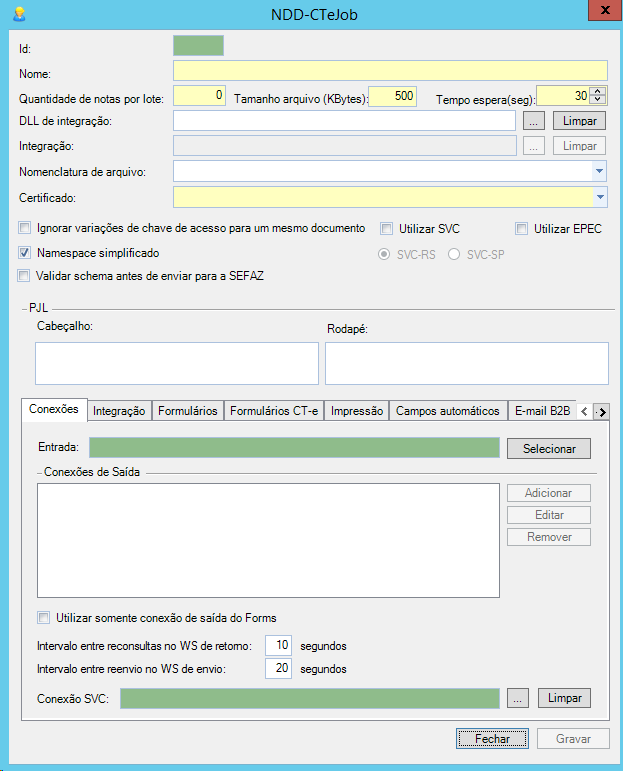 Caso seja processada uma CT-e com o tipo de emissão 7 (SVC-RS) ou 8 (SVC-SP) e não estejam configurados os WebServices na conexão de saída SVC será utilizada para o envio a conexão de saída vinculada ao job.