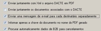 É possível também optar por enviar o DACTE em PDF, juntamente com o XML, bem como enviar os documentos associados juntamente com o DACTE. E se desejar enviar mensagens de e-mail para cada destinatário separadamente, ou seja, enviar e-mail individual para cada destinatário.