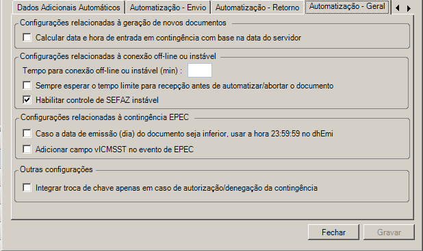 •Automatizar a geração de contingência para documentos pendentes de envio abortados: Quando marcada irá criar um novo documento em substituição de um documento pendente de envio que tenha sido abortado.