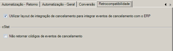 •Utilizar layout de integração de cancelamento para integrar eventos de cancelamento com o ERP: Permite receber integrações de eventos de cancelamento no formato de cancelamento (canc). Quando marcada a opção Não retornar códigos de eventos de cancelamento, fará com que os documentos cancelados por cStat 135 retorne na integração o cStat 101, e cancelados pelo cStat 155 integrar o cStat 151.