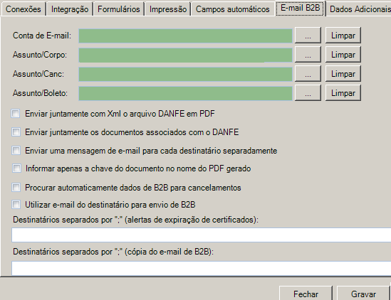 As informações de "B2BDirectory" e "B2BPDFDirectory" quando informadas no arquivo, irão agregar com as informações da aba, demais campos se existem na aba e no arquivo, sempre prevalecerá o arquivo. Somente o nomes "B2B", "B2BDirectory" e "B2BPDFDirectory" permitirá configurar quantas ocorrências forem necessárias. |