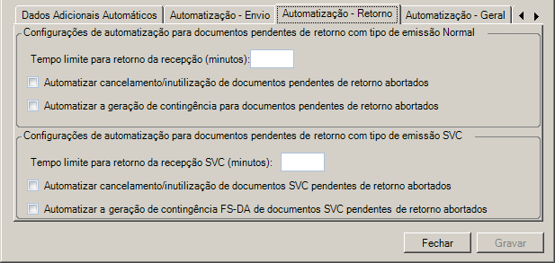 •Configurações de automatização para documentos pendentes de retorno com tipo de emissão SVC: